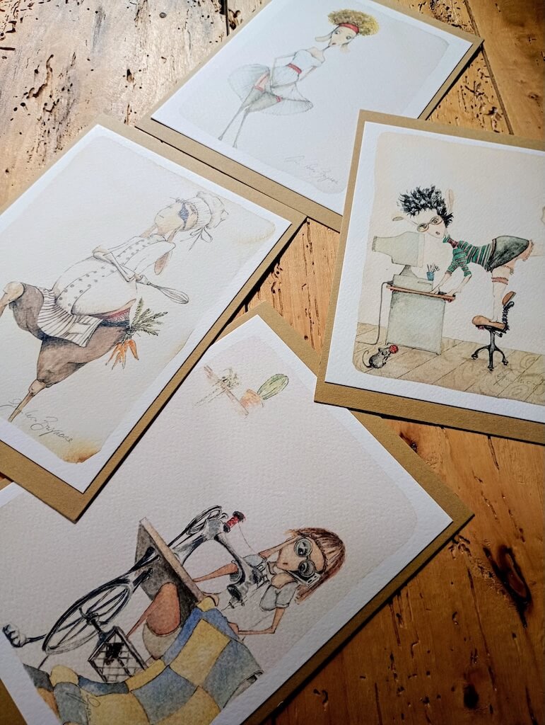 Le dipingo ad acquerello, lasciando che ogni velatura porti con sé un soffio di leggerezza, un sorriso, un frammento di buonumore che spero arrivi agli occhi – e al cuore – di chi osserva. La stampa in vendita è una stampa digitale su carta tamburata. Viene spedita in un cartoncino color avana che protegge con cura gli angoli durante il viaggio e che, una volta arrivata, può trasformarsi in un piccolo passepartout.