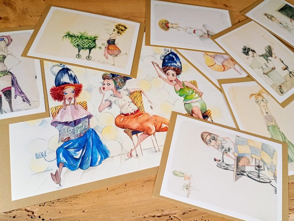 Le dipingo ad acquerello, lasciando che ogni velatura porti con sé un soffio di leggerezza, un sorriso, un frammento di buonumore che spero arrivi agli occhi – e al cuore – di chi osserva. La stampa in vendita è una stampa digitale su carta tamburata. Viene spedita in un cartoncino color avana che protegge con cura gli angoli durante il viaggio e che, una volta arrivata, può trasformarsi in un piccolo passepartout.